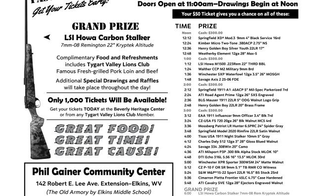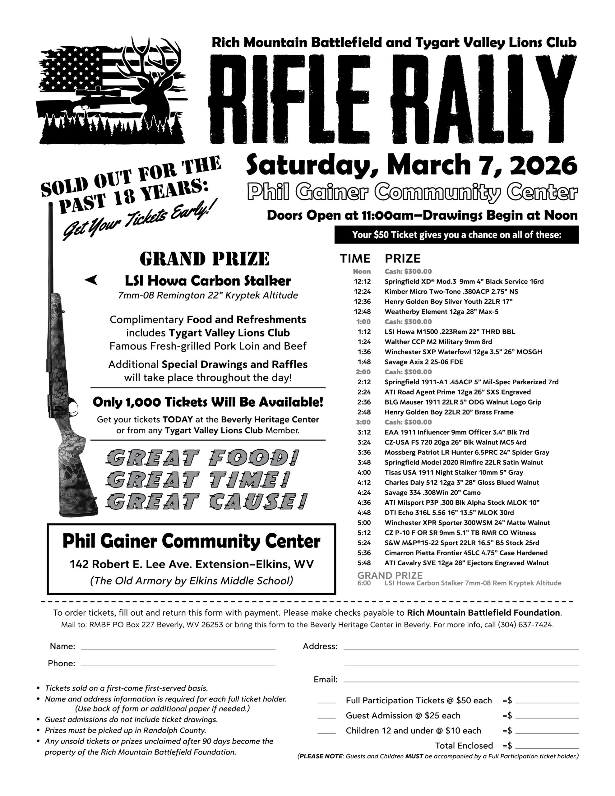 Presented by the Rich Mountain Battlefield Foundation and the Tygart Valley Lions Club, the annual Rifle Rally is well-known for great food and great prizes! We have sold out for the past 18 years, so get your tickets soon. Full tickets are $50 each. Each full ticket holder may also purchase a guest ticket for $25 and Under-12 child tickets for $10. How to purchase tickets: Contact a Tygart Valley Lions Club member Pay by cash, check, or credit card in-person at the Beverly Heritage Center (10am to 5pm, Wed-Sun) Call the Beverly Heritage Center and pay over the…